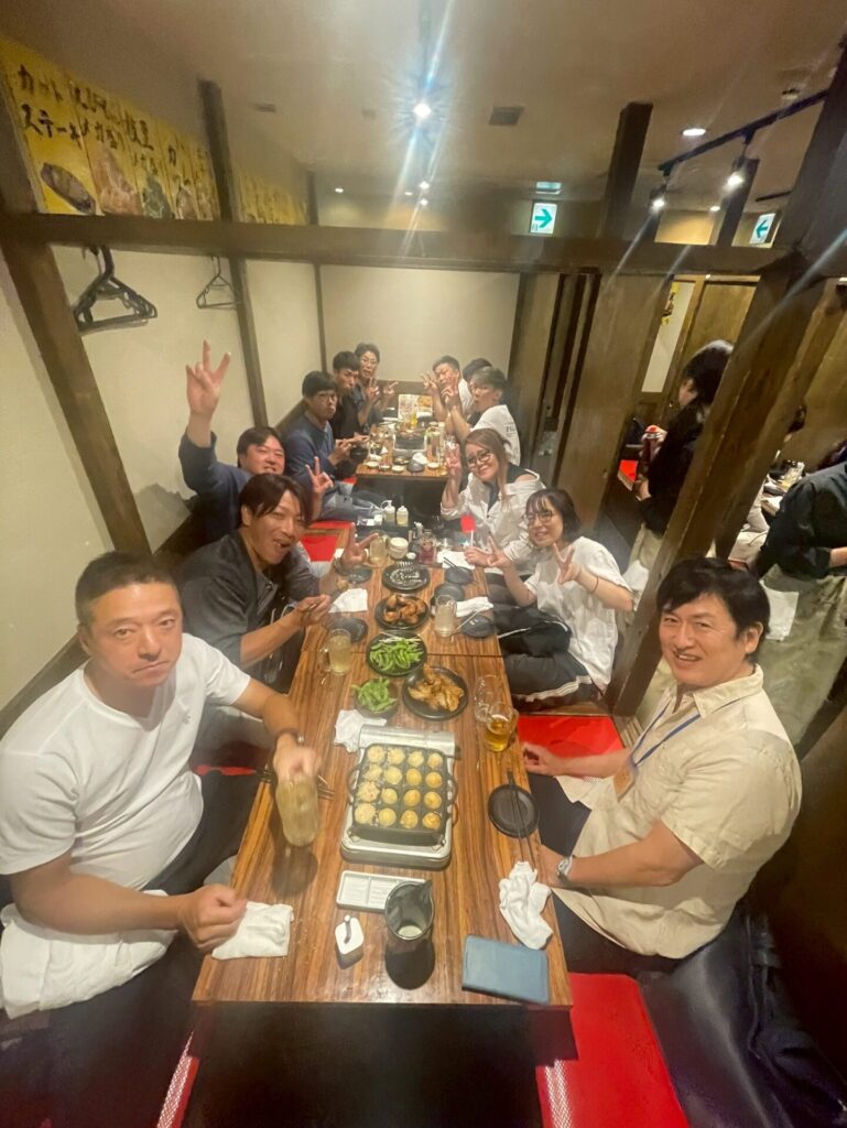 「大阪最後の夜は、とにかく食べて飲んで、騒ごう!」を合言葉に、美味しい料理とお酒で乾杯しました! 活気あるお店の雰囲気と、大阪グルメが、社員たちのテンションをさらに引き上げてくれます。