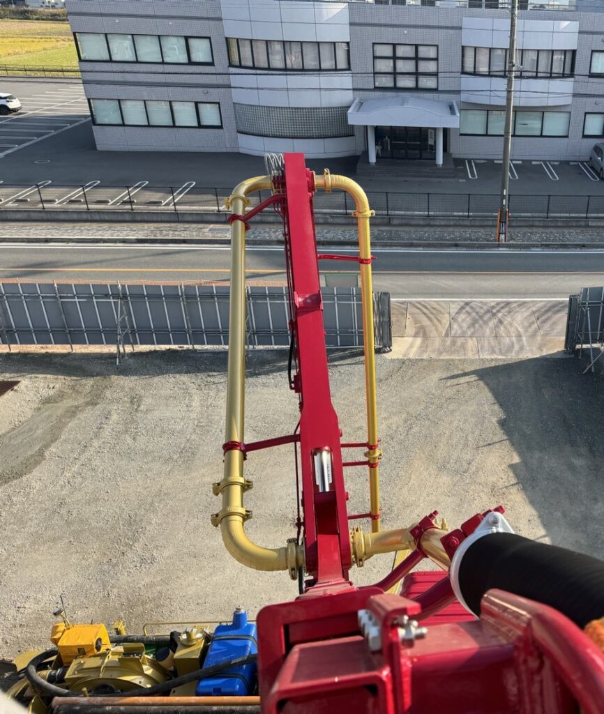 ここから、ポンプ車のピストンまたはスクイーズの仕組み(※高層や大規模現場では高圧で送れるピストン式が主流です)によって、生コンクリートが配管へと送り込まれ、圧送がスタートします。