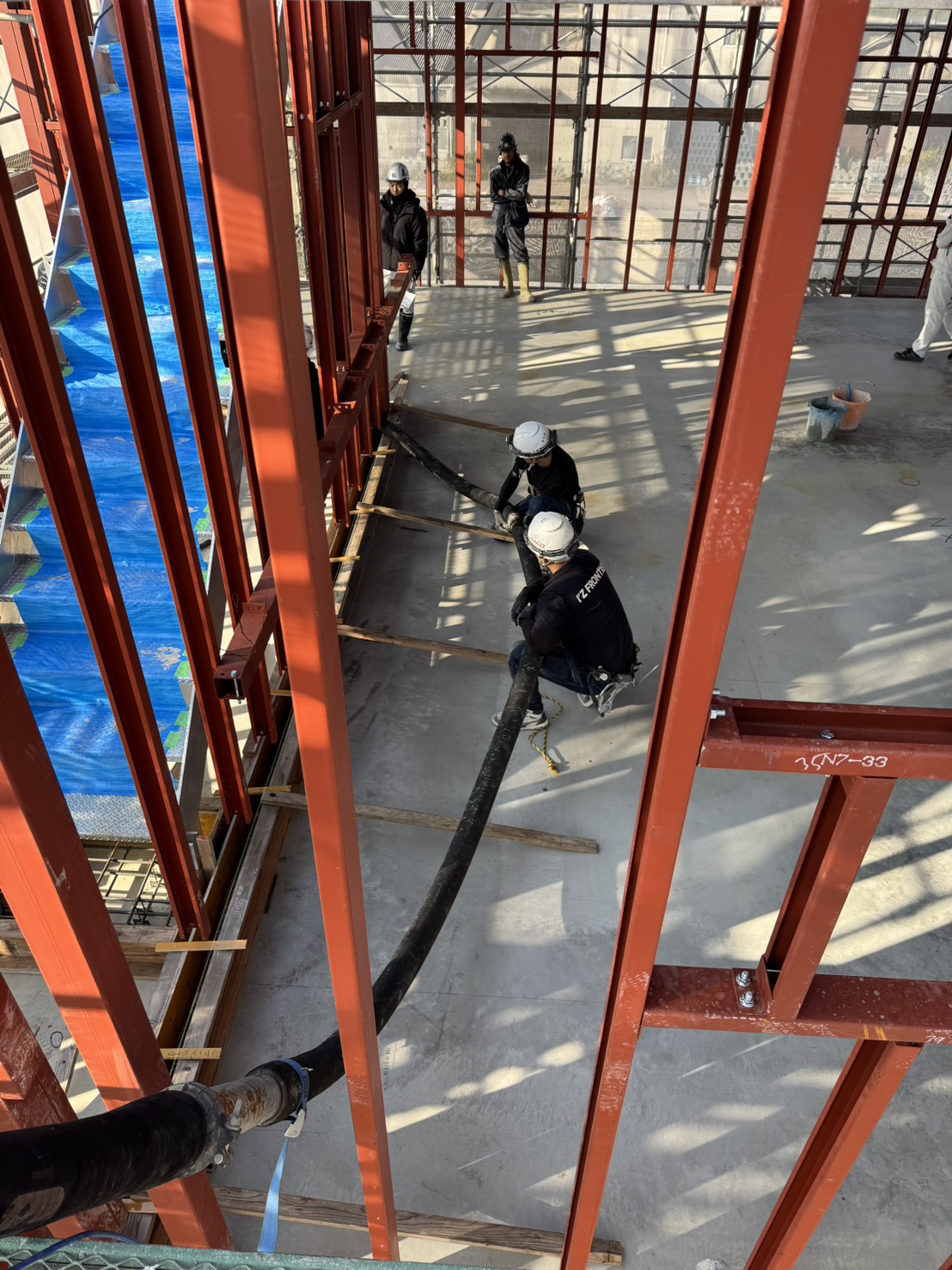 コンクリート圧送のハイライトは、オペレーターによるブーム(アーム)の操作と、打設箇所でホースの先端(筒先)を持つ作業員の連携です。