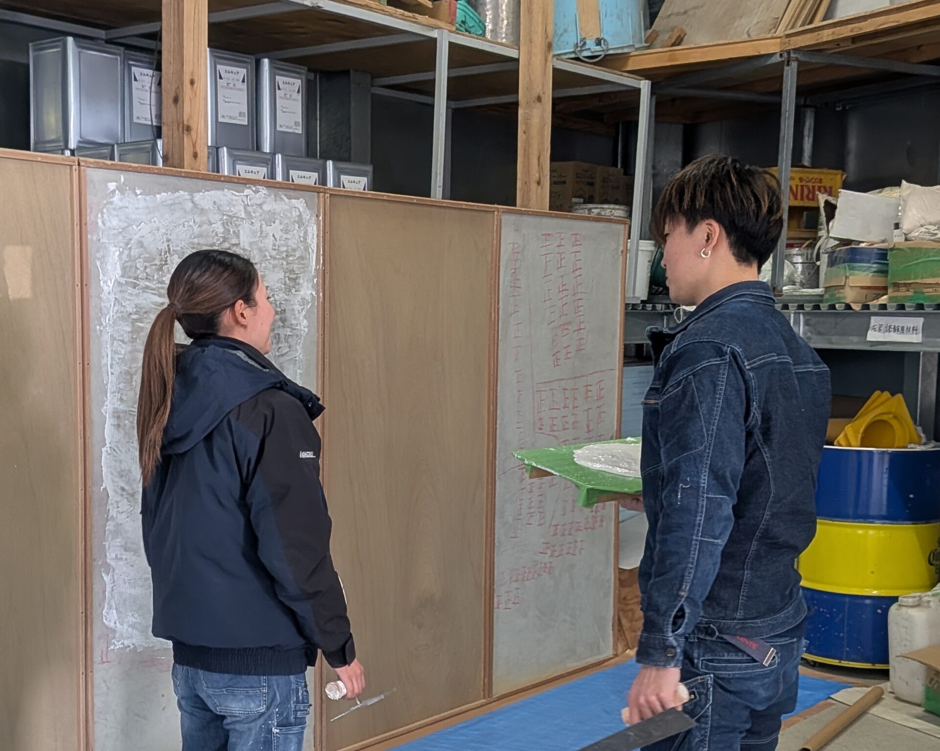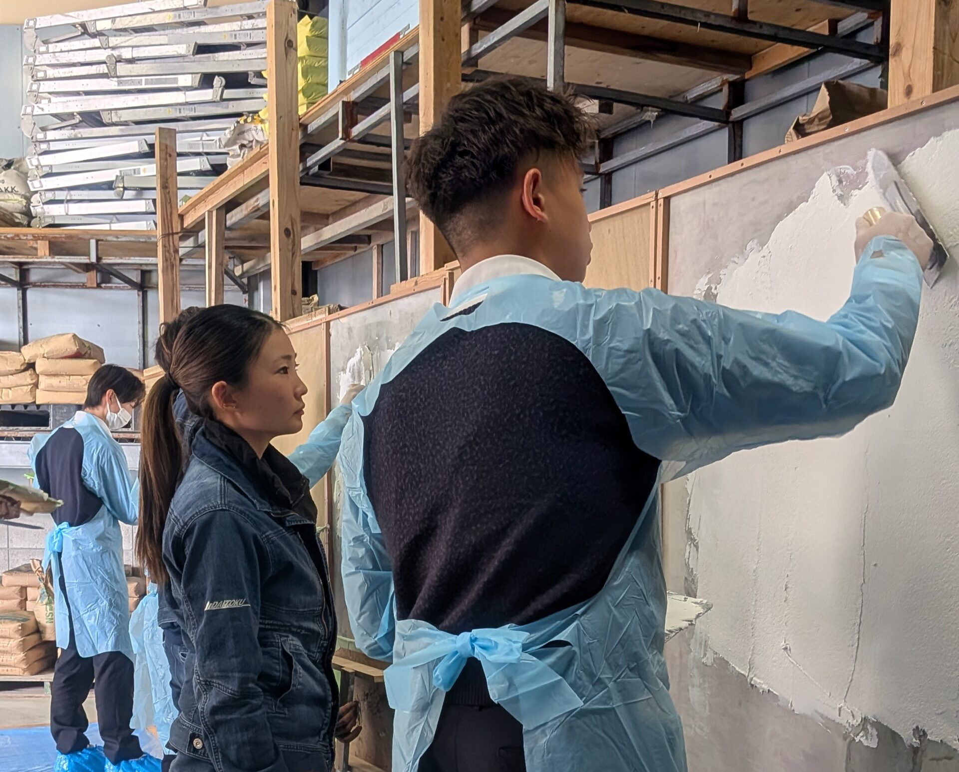 「最初は鏝(こて)が重く感じるよね」「手首はこう返すんだ」 そう語りかける先輩の脳裏には、きっとちょうど1年前の自分の姿が浮かんでいたはずです。