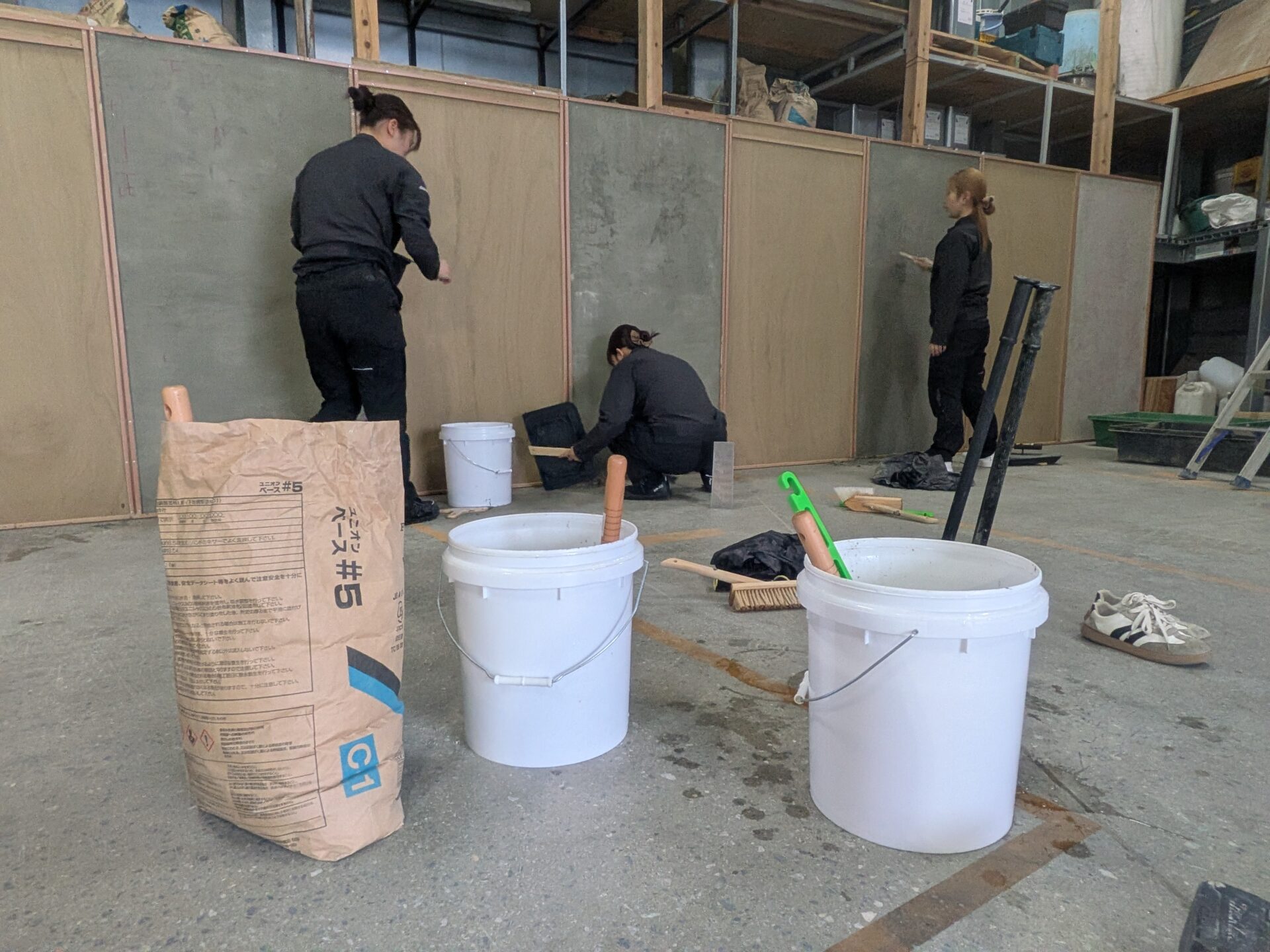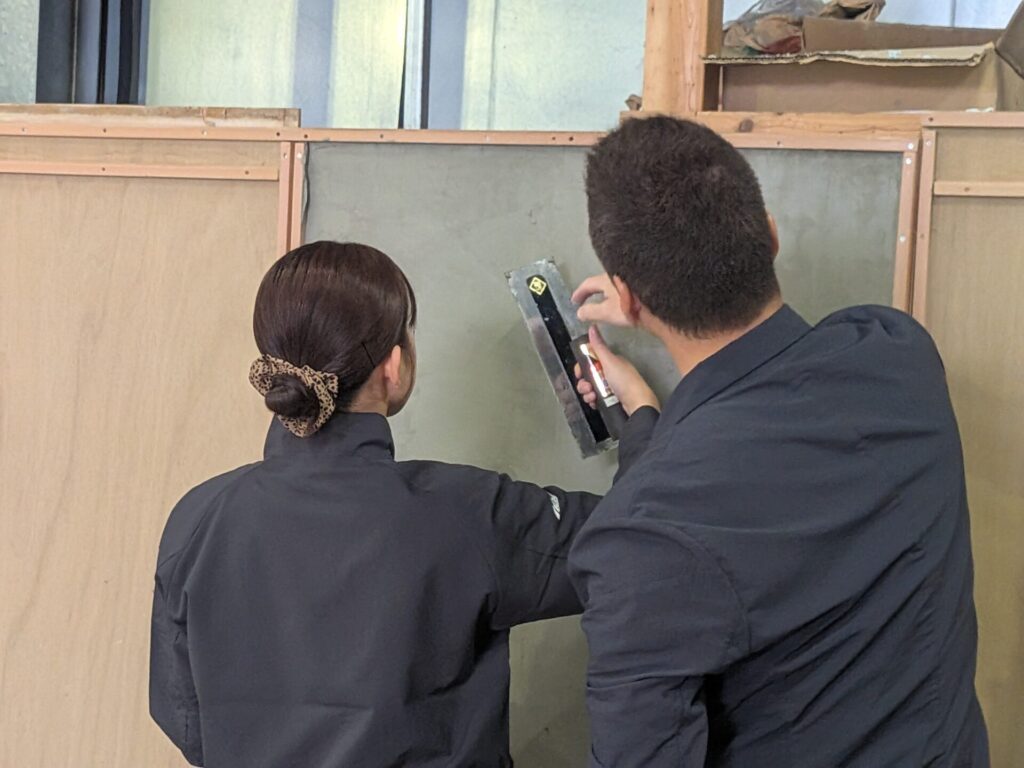 先日、社内テストに見事全員合格した新入社員の皆さん。 いよいよ現場に出るための最終段階として、今回は「実際の左官材料」を使った研修を行いました!📸